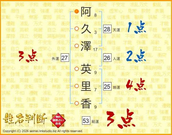 阿(8画)久(3画)澤(17画) 英(9画)里(7画)香(9画)