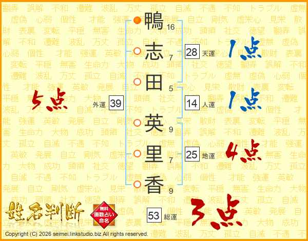 鴨(16画)志(7画)田(5画) 英(9画)里(7画)香(9画)