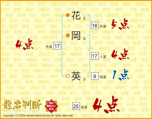花(8画)岡(8画) 英(9画)