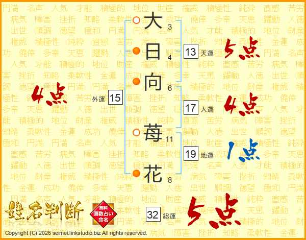 生活面を象徴する運勢です。外部から受ける影響力を表し、結婚運、家庭運や職場、環境への順応性を表します。総運から人運を引いた画数。姓や名が1文字の場合を除く。
