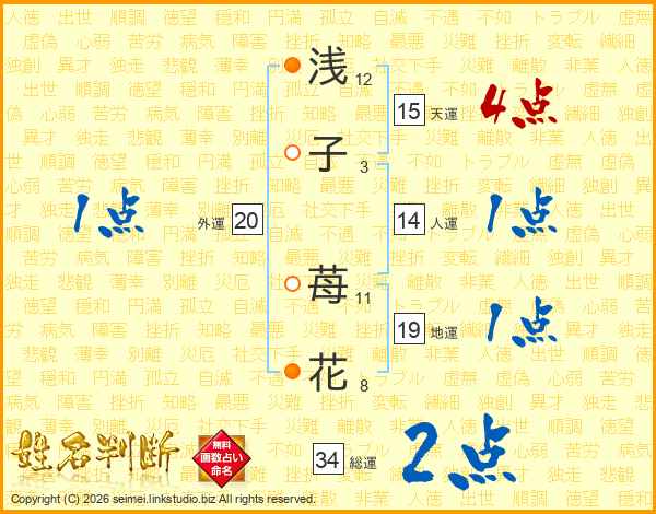 生活面を象徴する運勢です。外部から受ける影響力を表し、結婚運、家庭運や職場、環境への順応性を表します。総運から人運を引いた画数。姓や名が1文字の場合を除く。