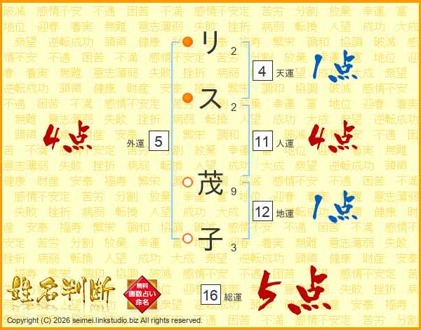 リ(2画)ス(2画) 茂(9画)子(3画)