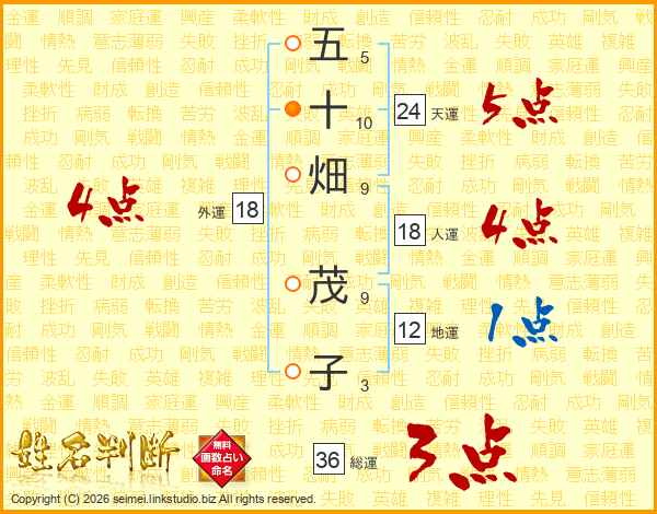 五(5画)十(10画)畑(9画) 茂(9画)子(3画)