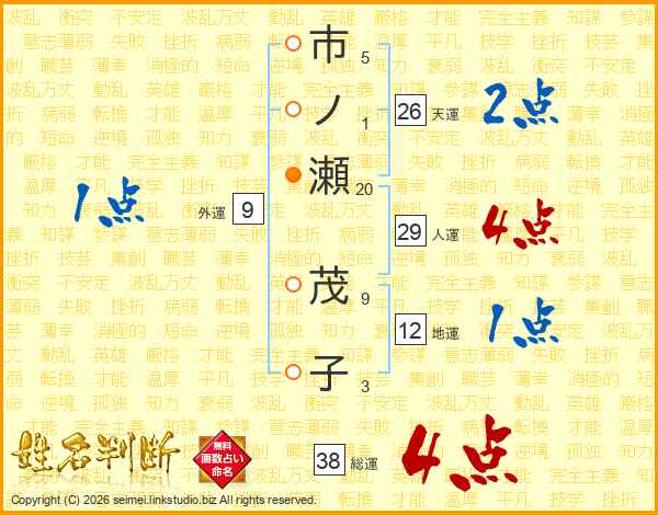 市(5画)ノ(1画)瀬(20画) 茂(9画)子(3画)