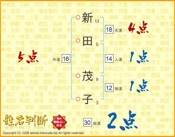 新(13画)田(5画) 茂(9画)子(3画)