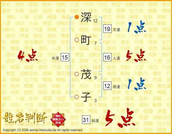 あなたの人生を表す1番重要な運勢です。生涯を通じて影響する総合運となり、主に50歳以降の晩年期に影響を及ぼします。苗字と名前の合計画数。