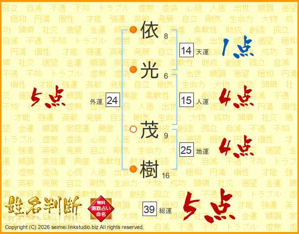 依(8画)光(6画) 茂(9画)樹(16画)