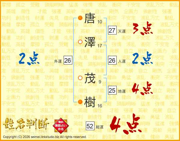 唐(10画)澤(17画) 茂(9画)樹(16画)
