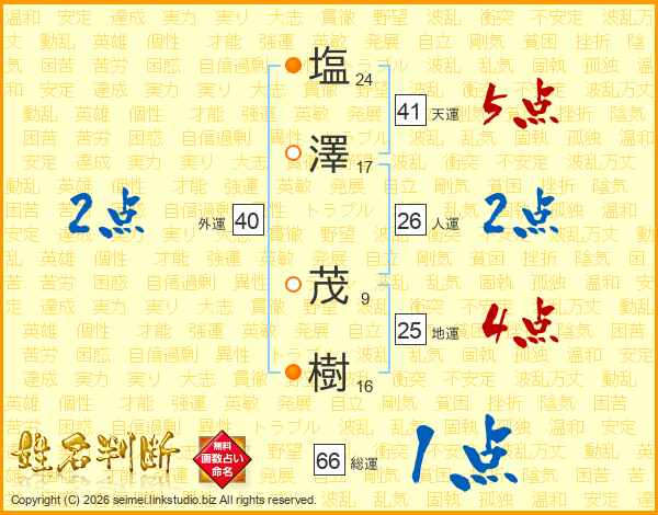 塩(24画)澤(17画) 茂(9画)樹(16画)