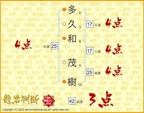 多(6画)久(3画)和(8画) 茂(9画)樹(16画)