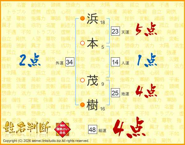 浜(18画)本(5画) 茂(9画)樹(16画)