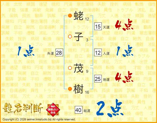 蛯(12画)子(3画) 茂(9画)樹(16画)
