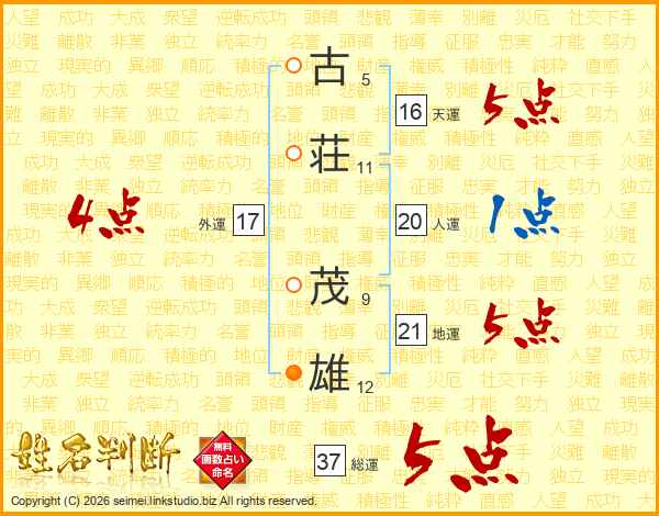 古(5画)荘(11画) 茂(9画)雄(12画)