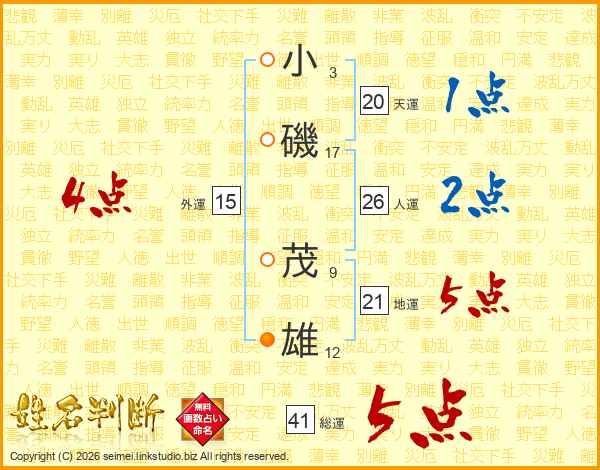 小(3画)磯(17画) 茂(9画)雄(12画)