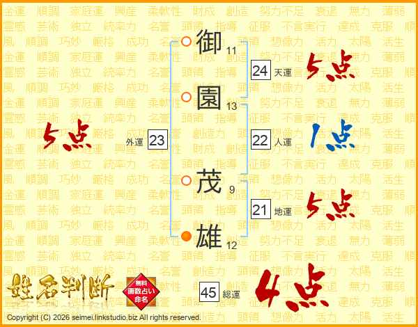 御(11画)園(13画) 茂(9画)雄(12画)