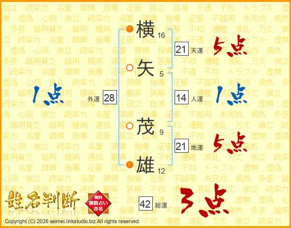 横(16画)矢(5画) 茂(9画)雄(12画)