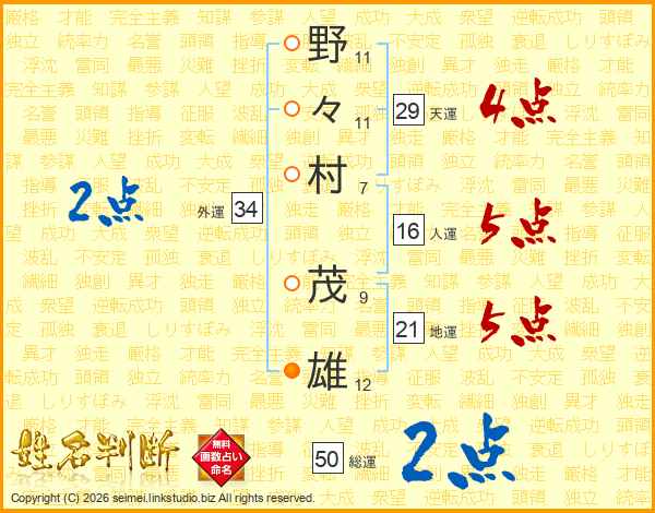 野(11画)々(11画)村(7画) 茂(9画)雄(12画)
