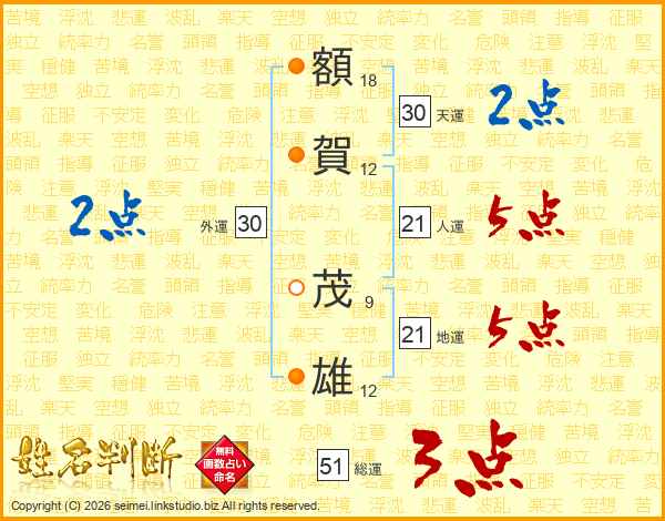 額(18画)賀(12画) 茂(9画)雄(12画)