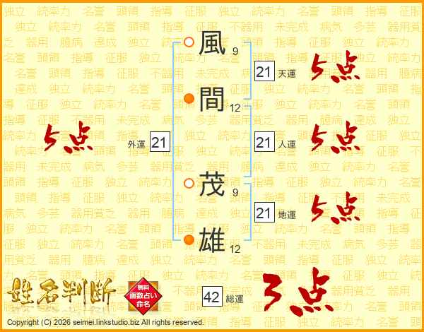 あなたの人生を表す1番重要な運勢です。生涯を通じて影響する総合運となり、主に50歳以降の晩年期に影響を及ぼします。苗字と名前の合計画数。