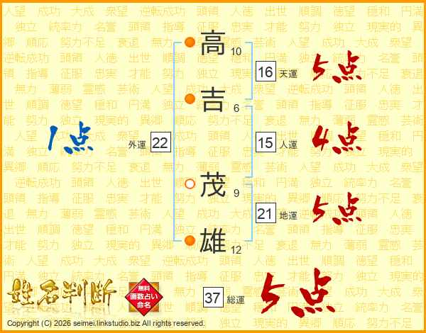 高(10画)吉(6画) 茂(9画)雄(12画)