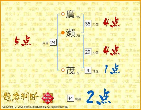 あなたの人生を表す1番重要な運勢です。生涯を通じて影響する総合運となり、主に50歳以降の晩年期に影響を及ぼします。苗字と名前の合計画数。
