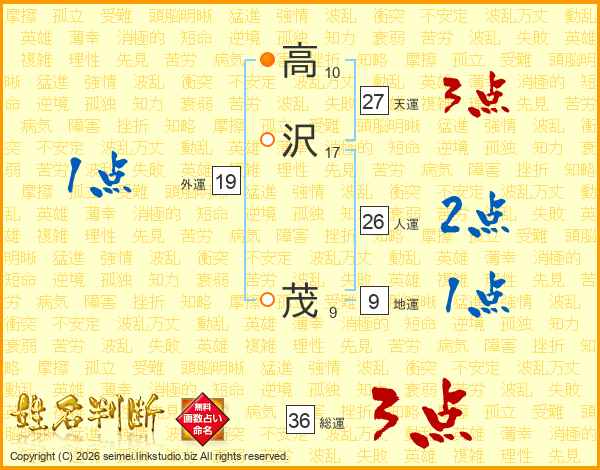 高(10画)沢(17画) 茂(9画)