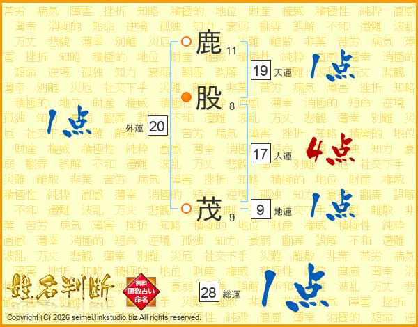 生活面を象徴する運勢です。外部から受ける影響力を表し、結婚運、家庭運や職場、環境への順応性を表します。総運から人運を引いた画数。姓や名が1文字の場合を除く。