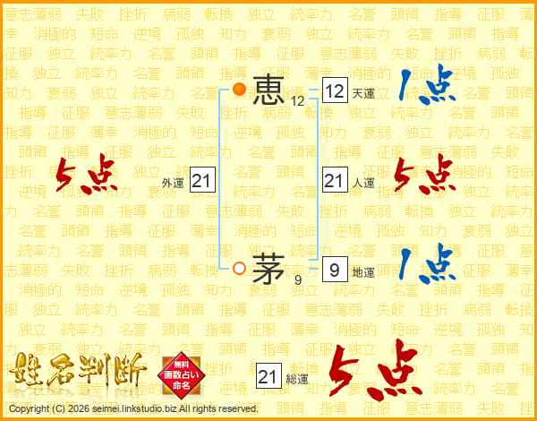 生活面を象徴する運勢です。外部から受ける影響力を表し、結婚運、家庭運や職場、環境への順応性を表します。総運から人運を引いた画数。姓や名が1文字の場合を除く。