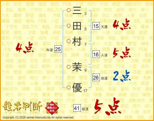 三(3画)田(5画)村(7画) 茉(9画)優(17画)