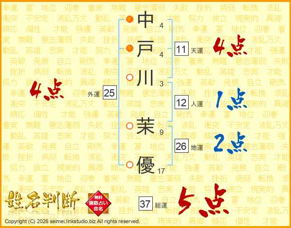 中(4画)戸(4画)川(3画) 茉(9画)優(17画)