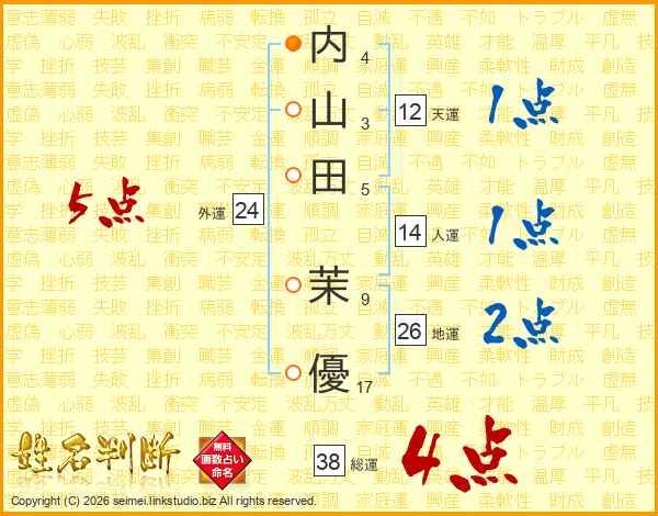 内(4画)山(3画)田(5画) 茉(9画)優(17画)
