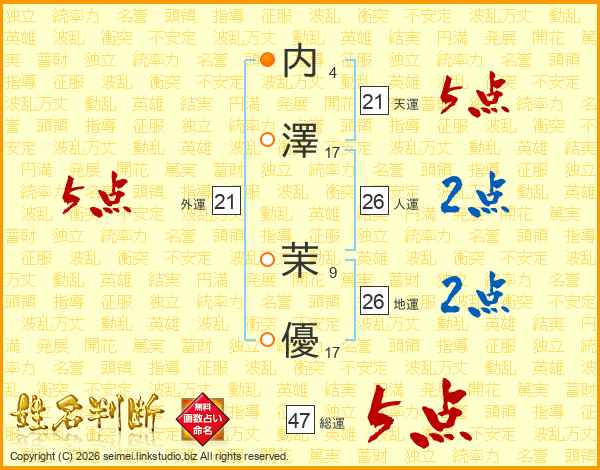 生活面を象徴する運勢です。外部から受ける影響力を表し、結婚運、家庭運や職場、環境への順応性を表します。総運から人運を引いた画数。姓や名が1文字の場合を除く。