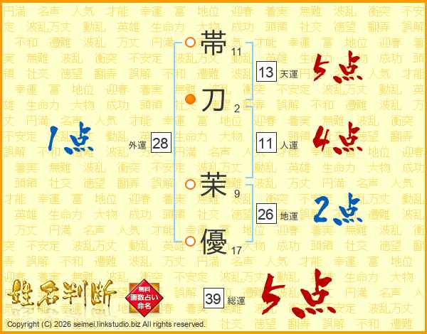 帯(11画)刀(2画) 茉(9画)優(17画)