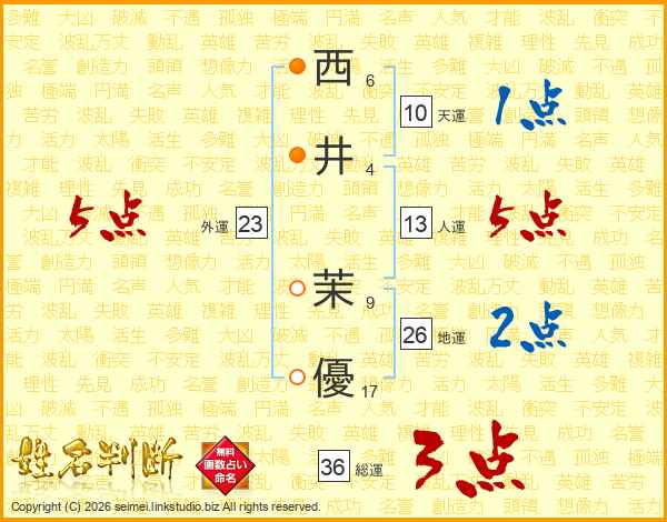 生活面を象徴する運勢です。外部から受ける影響力を表し、結婚運、家庭運や職場、環境への順応性を表します。総運から人運を引いた画数。姓や名が1文字の場合を除く。