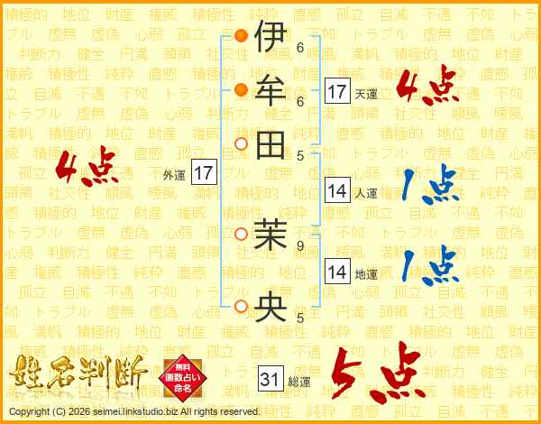伊(6画)牟(6画)田(5画) 茉(9画)央(5画)