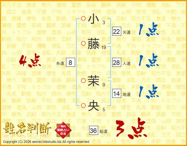 小(3画)藤(19画) 茉(9画)央(5画)