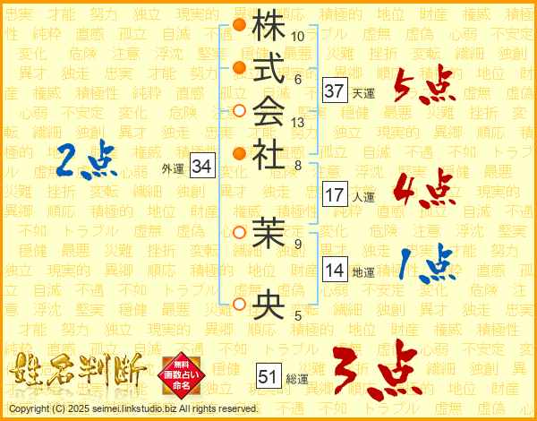株(10画)式(6画)会(13画)社(8画) 茉(9画)央(5画)