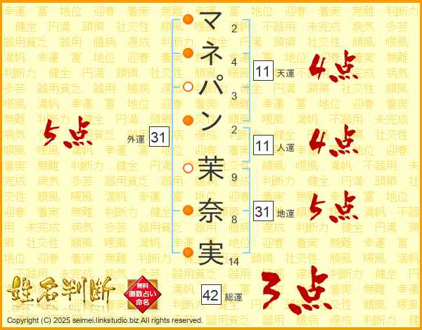 マ(2画)ネ(4画)パ(3画)ン(2画) 茉(9画)奈(8画)実(14画)