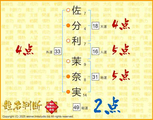 佐(7画)分(4画)利(7画) 茉(9画)奈(8画)実(14画)