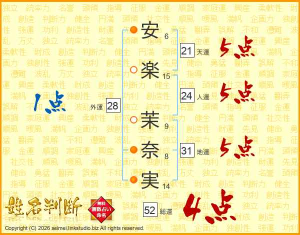 安(6画)楽(15画) 茉(9画)奈(8画)実(14画)