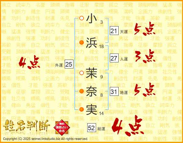 小(3画)浜(18画) 茉(9画)奈(8画)実(14画)