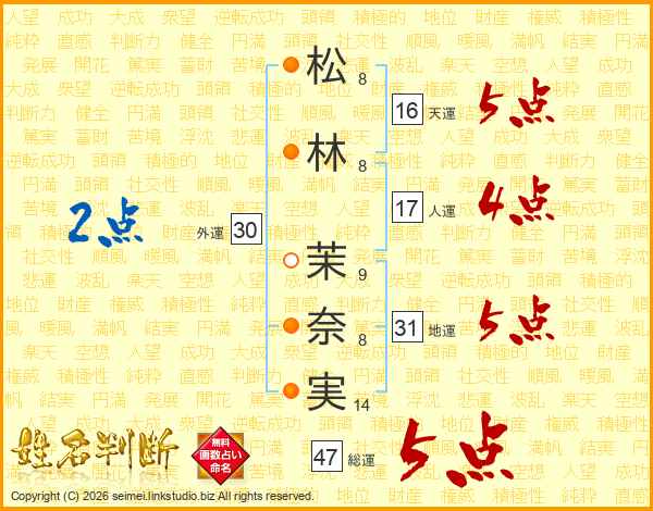 松(8画)林(8画) 茉(9画)奈(8画)実(14画)