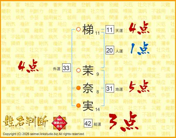 梯(11画) 茉(9画)奈(8画)実(14画)