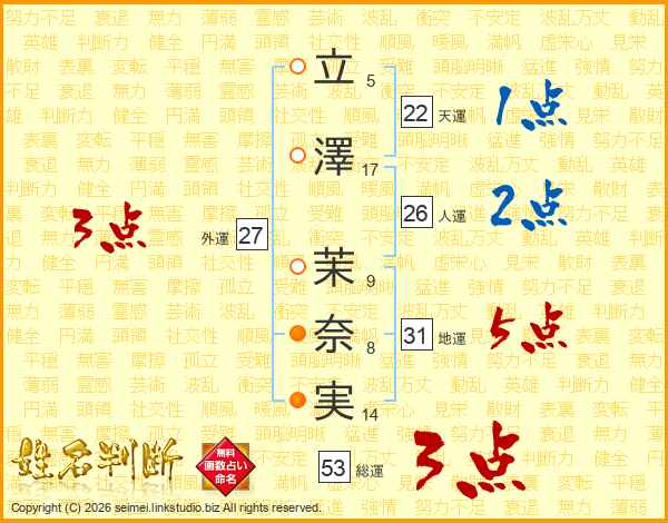 立(5画)澤(17画) 茉(9画)奈(8画)実(14画)
