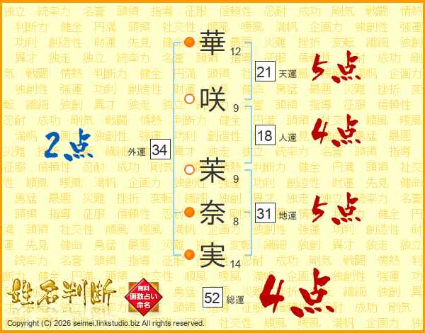 華咲茉奈実さんの総運は52画の4点!