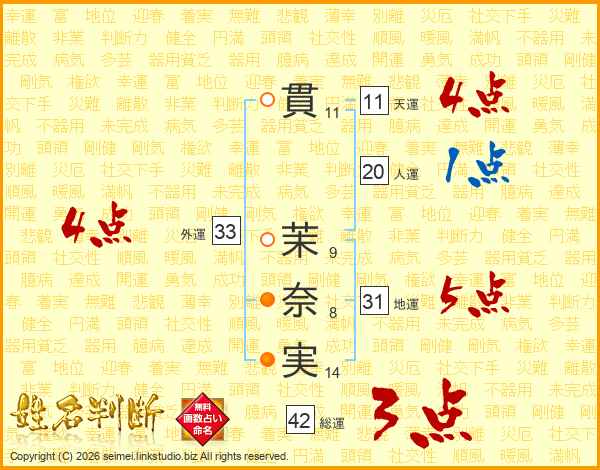貫(11画) 茉(9画)奈(8画)実(14画)