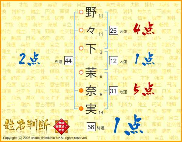 野(11画)々(11画)下(3画) 茉(9画)奈(8画)実(14画)