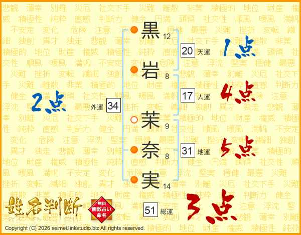 黒(12画)岩(8画) 茉(9画)奈(8画)実(14画)