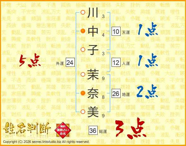 川(3画)中(4画)子(3画) 茉(9画)奈(8画)美(9画)