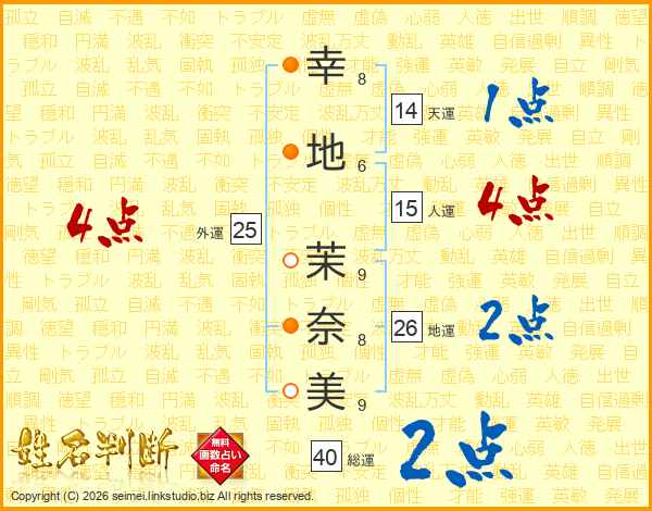 幸(8画)地(6画) 茉(9画)奈(8画)美(9画)